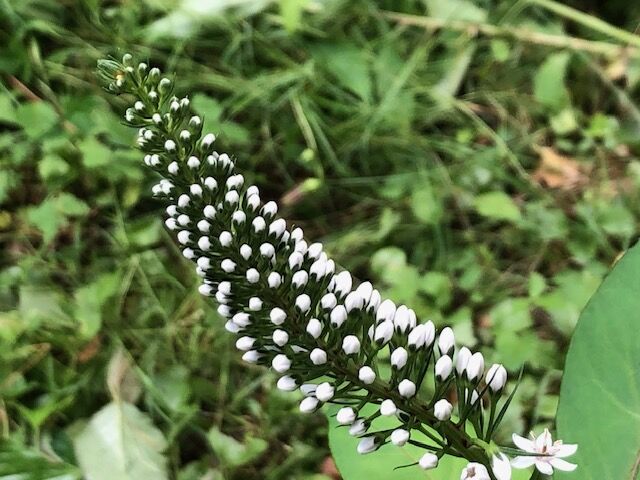 ホタルブクロに混じって虎の尾の花も咲き始めている。毎年同じ場所に何本も花を咲かせるが、余り拡張していく癖はないようだ。