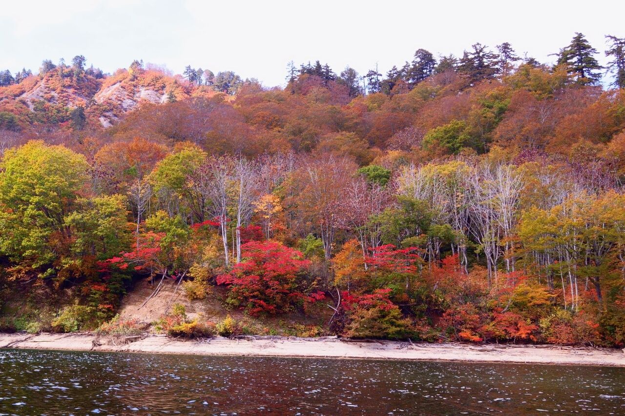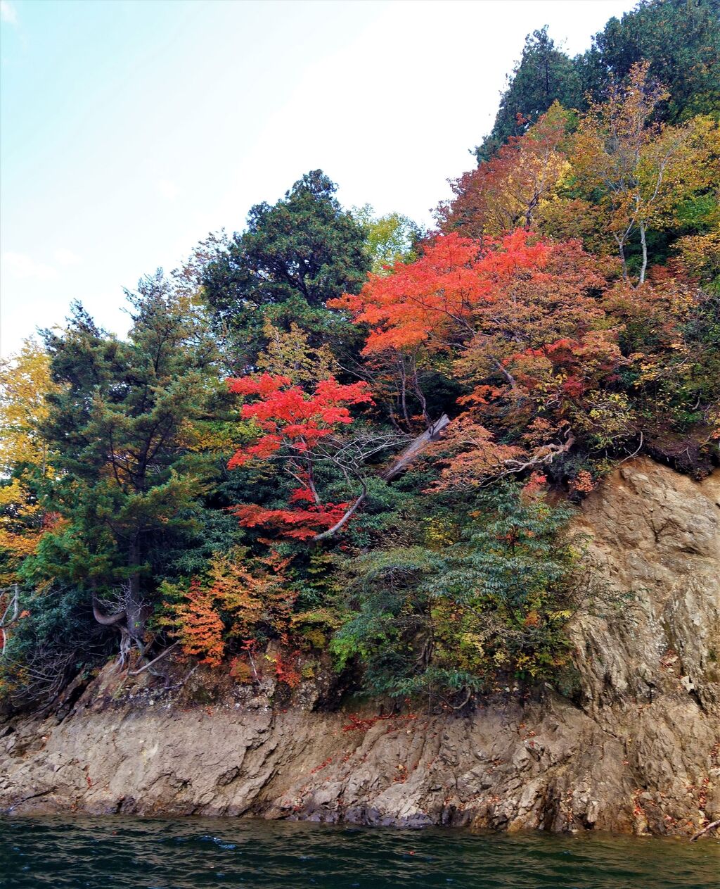 白く見える湖岸は殆どが急な岩場である。上陸はできない。出来るとすれば、沢沿いであろう。遠くの方に、白い枯れ木の一群と赤く染まった紅葉の樹木が見える。そこを目指した。そこが上陸可能地点かどうかはまだ分らない。